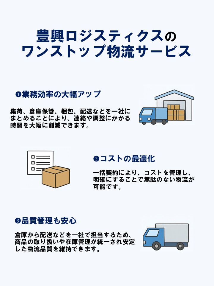 そんな課題を解決するのが、豊興ロジスティクスのワンストップ物流サービスです。