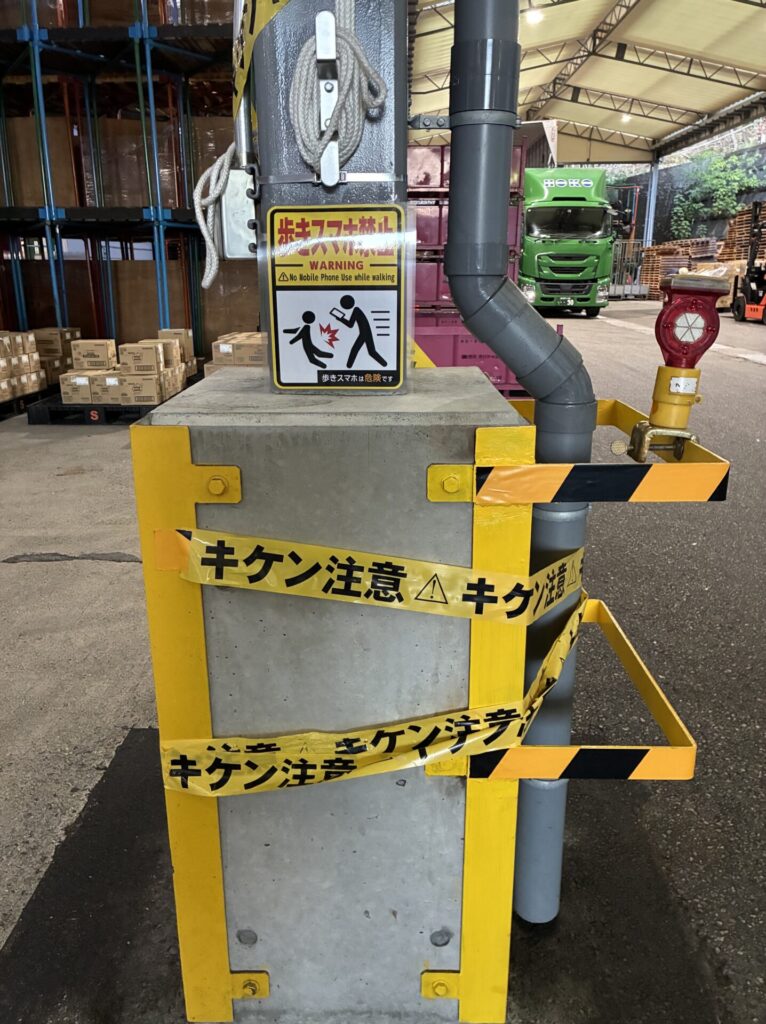 構内にある支柱には夜間に点灯する赤色ライトを設置し、トラックやフォークリフトの接触を未然に防いでいます。