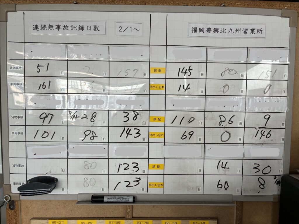 北九州営業所は、無事故や配送トラブル無しの継続日数を共有する仕組みがあります。