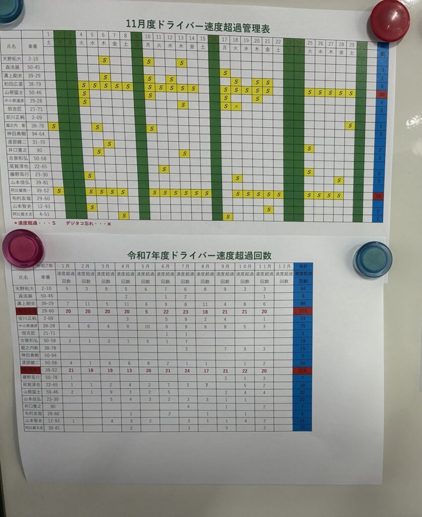 ドライバー全員の安全運転を徹底するために、速度超過管理表を掲示し、運行状況を共有しています。この取り組みは、ドライバーが自分自身の運転状況を客観的に把握できるようになり、安全運転への意識向上につながっています。